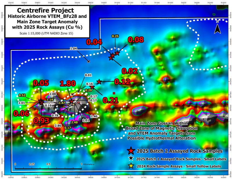 Vancouver, British Columbia – TheNewswire – January 26, 2026. Cascade Copper Corp. (CSE:CASC, FRA:91O ) (“Cascade” or the “Corporation”) is pleased to announce that it has received assay results from the second batch of samples from a field program of ground truthing geophysical anomalies and rock sampling at its Centrefire Copper and Gold Project (the “Project”) located ~40 kilometres northeast of Dryden, Ontario, Canada. The field work was completed in Q4 2025. This batch represents 16 of 41 rock samples that were collected across the Project. The results of the first batch of 13 samples were release on January 6th 2026 and included up to 2.86% Cu, 2.84 g/t Au, and 29.40 g/t Ag in grab samples. The Corporation is also pleased to announce that ongoing magnetic inversion modelling and compilation is revealing excellent priority target follow-up areas for mapping, sampling, and possibly drilling.