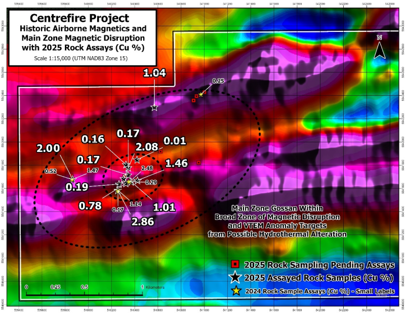 Vancouver, British Columbia – January 8, 2026 – TheNewswire – Cascade Copper Corp. (CSE:CASC, FRA:91O ) (“Cascade” or the “Corporation”) is pleased to announce that it has received assay results from the first batch of samples from a field program of ground truthing geophysical anomalies and rock sampling at its Centrefire Copper and Gold Project (the “Project”) located ~40 kilometres northeast of Dryden, Ontario, Canada. The field work was completed in Q4 2025. A total of 41 rock samples were collected across the Project and results from 13 have been received, while 16 are pending. The majority of the 13 samples are located within the vicinity of the Main Gossan Zone (MGZ), where previous work by the company included trenching and grab sampling. A live discussion of the results will be held on Friday January 9th at 1pm EST. Register here to join.