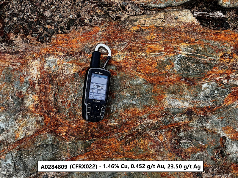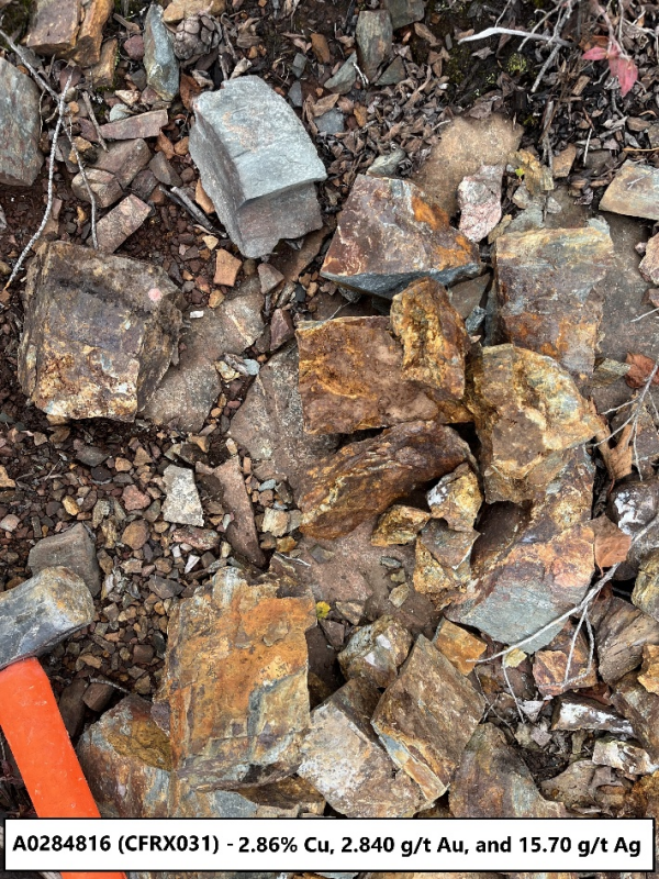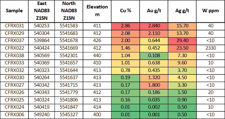 - 5 of the 13 grab samples assayed greater than 1% copper, while 4 of the samples assayed greater than 1.0 g/t gold, and 4 assayed greater than 10 g/t silver.