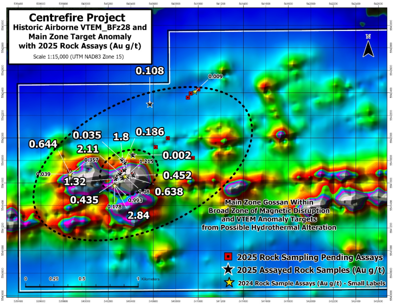 Figure 2: Gold assays from recent and previous sampling at the Main Gossan Zone at Centrefire. Background image is from a historic airborne VTEM survey showing the conductor trends